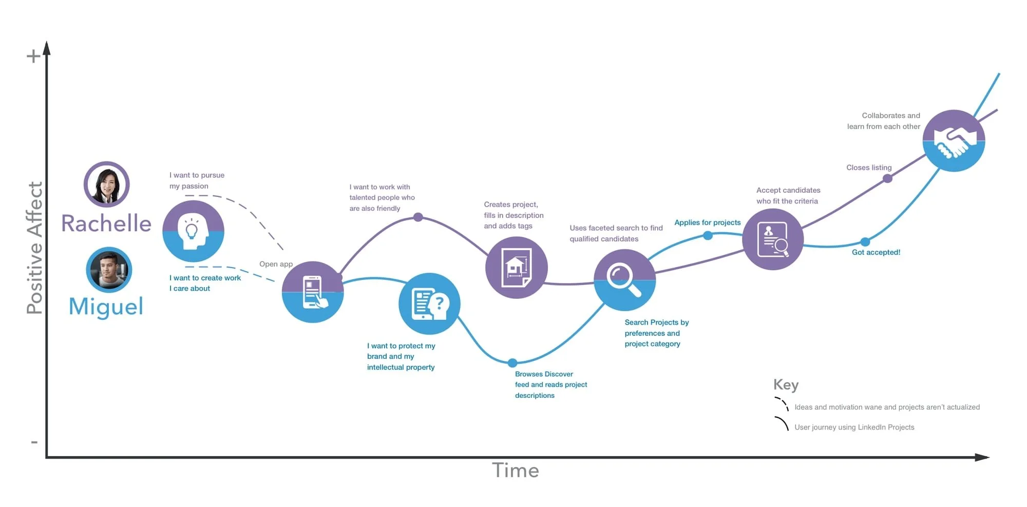 Using this research, we synthesized the data via affinity diagramming. The initial look was unpromising. We had wanted to connect people for private or group tutoring sessions. However, our data could not indicate any desire for connections this way. In addition, there were many established tutoring avenues people could take to learn things. Fortunately, we noticed a little insight that we had jotted down that had heretofore been ignored: people who made passion projects. With this flash of insights, we connected the dots: we could have two types of users, one user who had passion projects and needed people’s help on them, and the other user, a person who wants professional skills but may find it difficult to get actual experience applying those skills he or she is learning. With this in mind we went back screened people again for people who did passion projects (since this wasn’t in our original screener) and conducted a second round of interviews with project creators to learn more about them, as well as learn more about our original skill-learners.