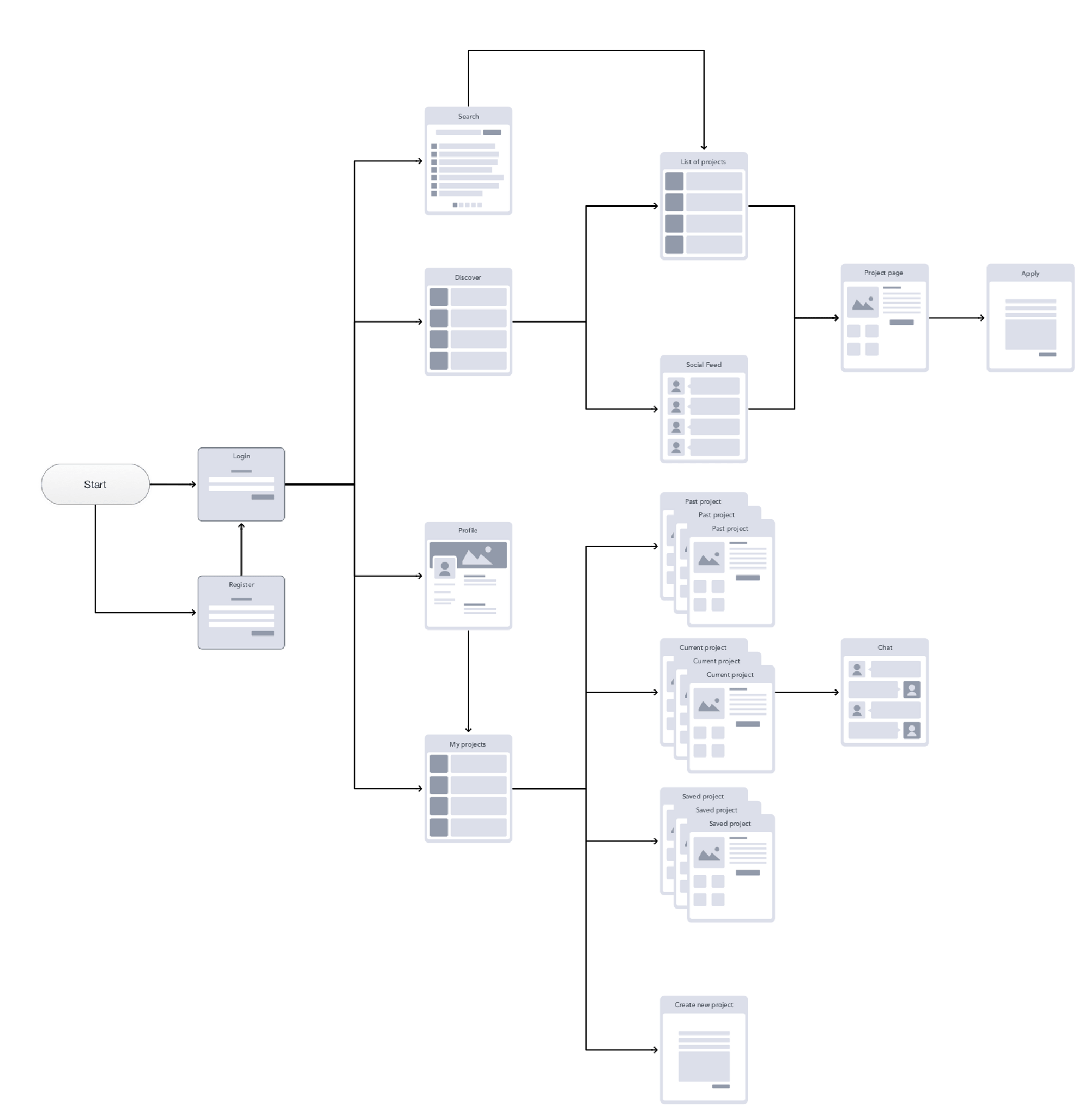 After this, we started wireframing in medium fidelity so that we could start creating the prototype and testing our design. To help visualize and remind us how the app would flow, I created an app map to help guide us while creating the wireframes. One of my teammates was in charge of creating the wireframes and created a medium fidelity wireframe which we then put into InVision and tested while he started working on the High fidelity prototype. This way we could parallel process and save time.
